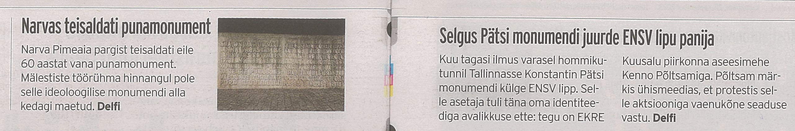 Kuuenda lehekülje uudis kandis pealkirja „Narvas teisaldati punamonument” ja oli selline: „Narva Pimeaia pargist teisaldati eile 60 aastat vana punamonument. Mälestiste töörühma hinnangul pole selle ideoloogilise monumendi alla kedagi maetud.”