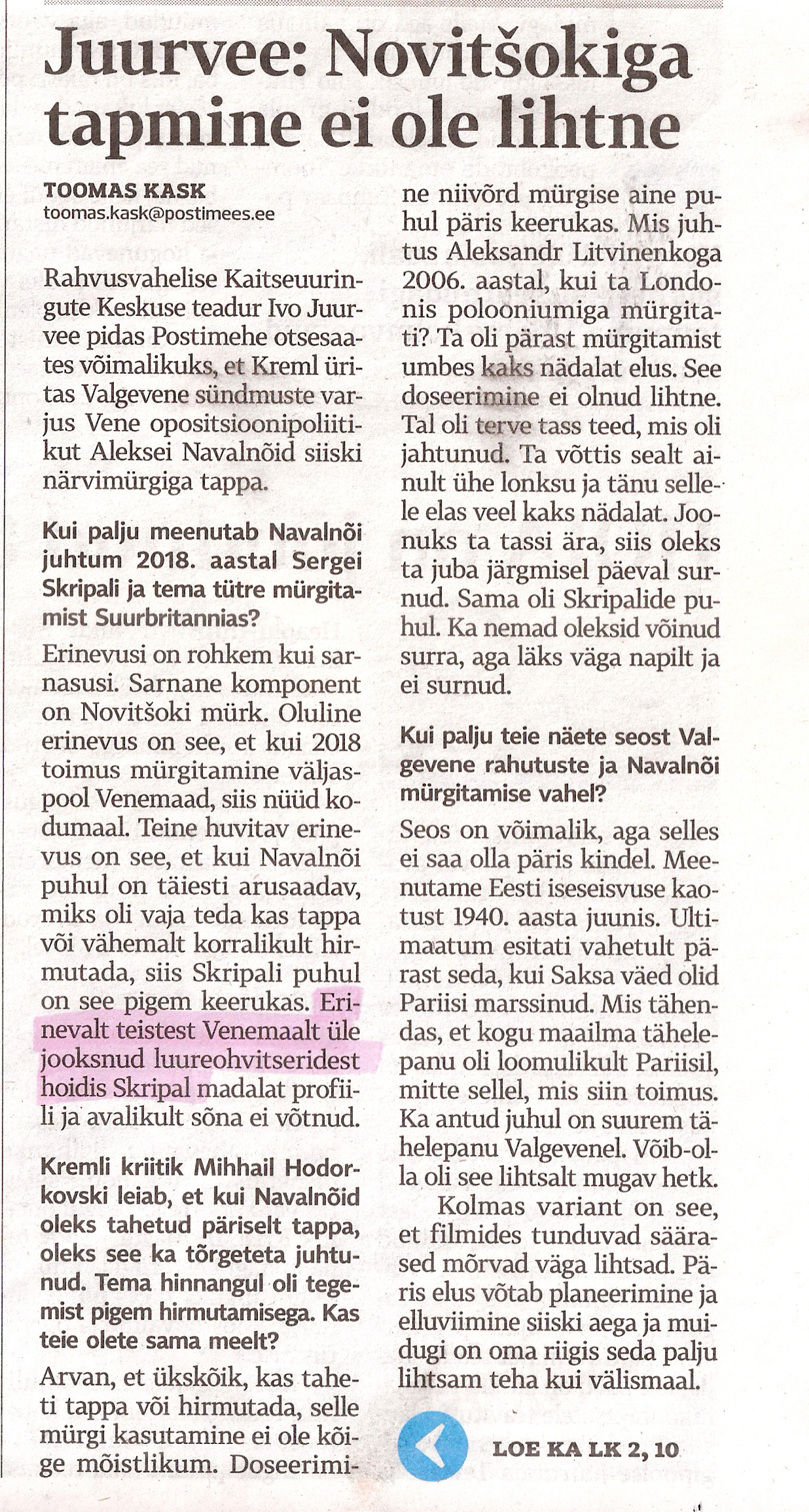 Selline mulje igatahes jääb, kui lugeda „Postimehes” 4. septembril 2020 ilmunud kirjutist „Juurvee: Novitšokiga tapmine ei ole lihtne” (autor: Toomas Kask). Seal öeldakse selge sõnaga: „Erinevalt teistest Venemaalt üle jooksnud luureohvitseridest hoidis Skripal madalat profiili ja avalikult sõna ei võtnud.”