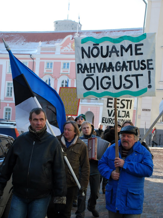 Heiki Treier (paremal) oli esirinnas väga paljudel Rahvuslaste Tallinna Klubi ettevõtmistel. Nagu ka klubi üks vaimseid juhte, Heiki kõrval sammuv Hannes Vanaküla ja nende vahel Eesti lippu kandev Aimer Halop. Pilt: Heiki Treieri arhiiv