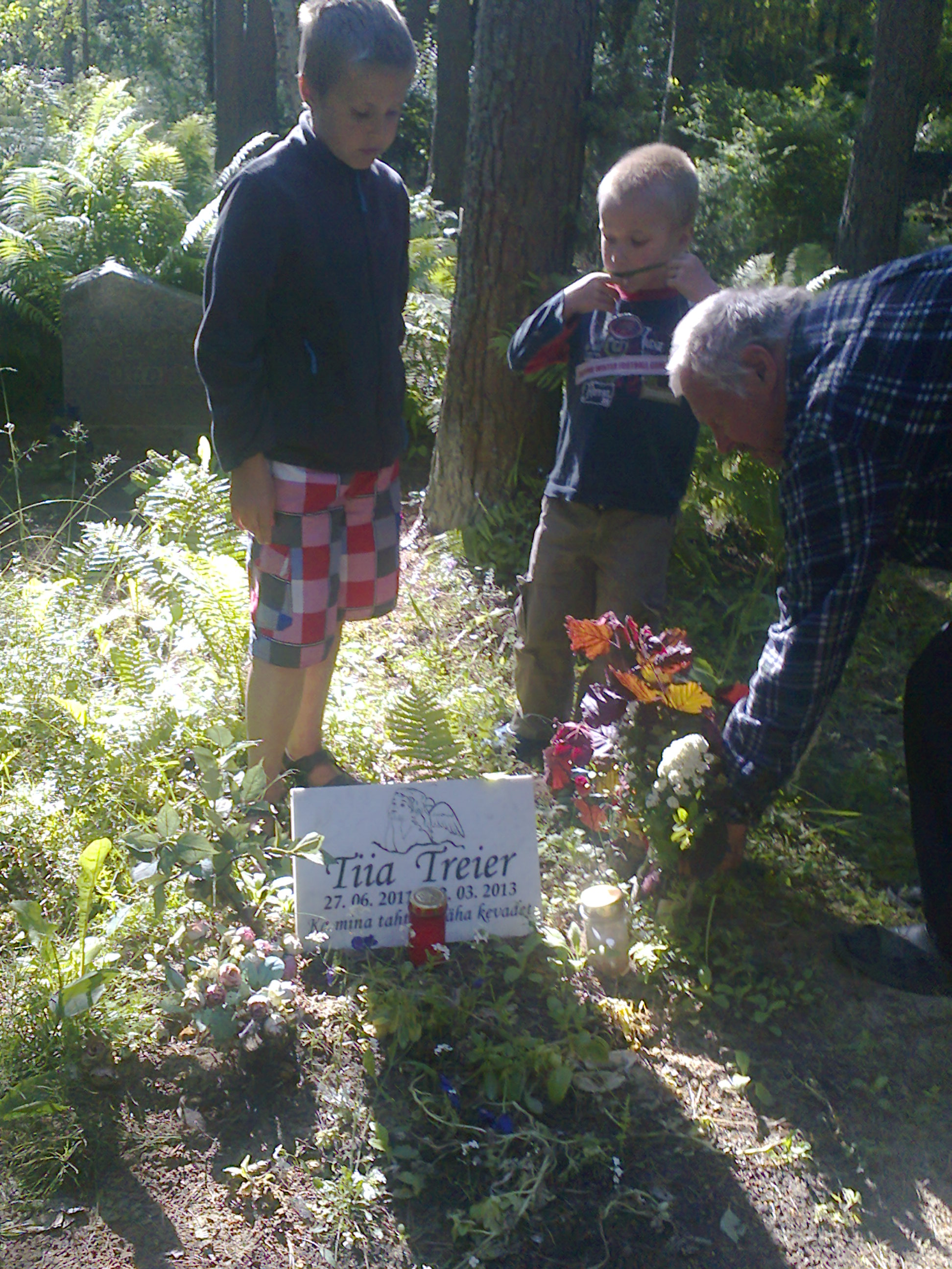 Heiki koos kahe pojaga oma süütulthukkunud pisitütre haual. Pilt: Heiki Treieri arhiiv